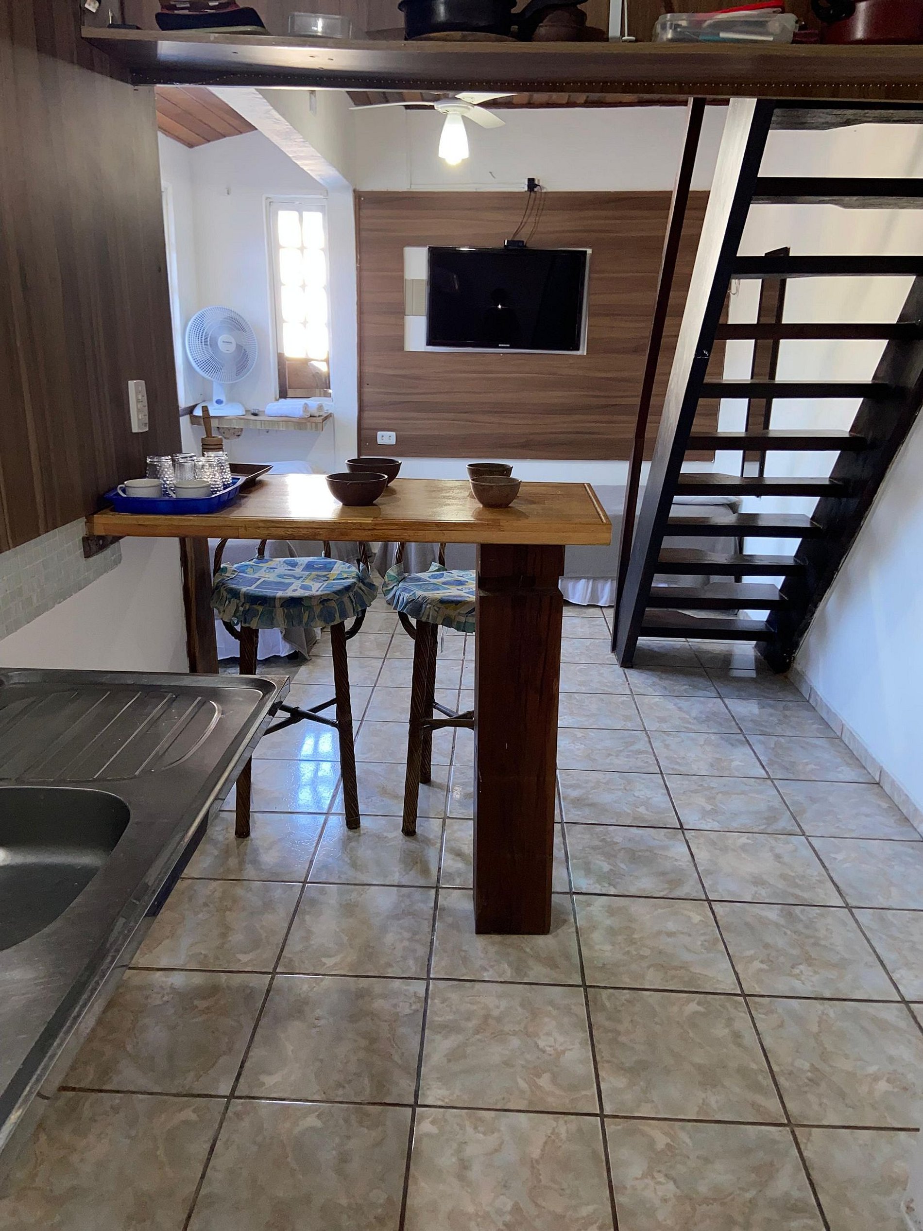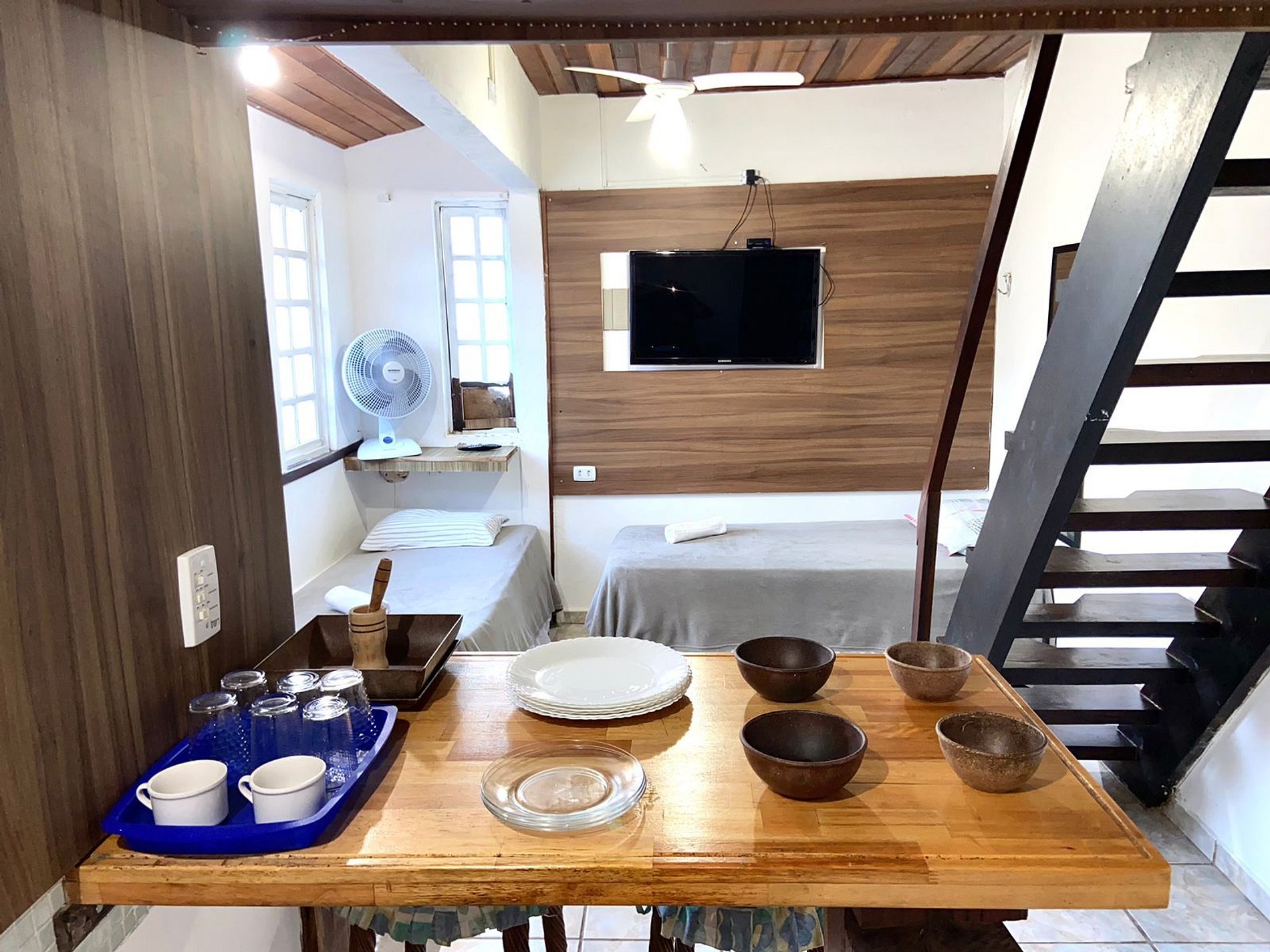 Nossa Chalé é Duplex, na parte de baixo tem a sala acoplado a cozinha e ao banheiro privativo e + 2 camas de solteiro, no mesanino tem 2 cama de casal + 1 Cama de Solteiro, com ar-condicionado. O chalé tem Cozinha com fogão. micro-ondas, frigobar, utensílios de cozinha, Tv com todos os canais, roupa de cama, toalhas e banheiro privativo, dando total acesso as nossas áreas comuns como Piscina, estacionamento Churrasqueira e cozinha compartilhada.