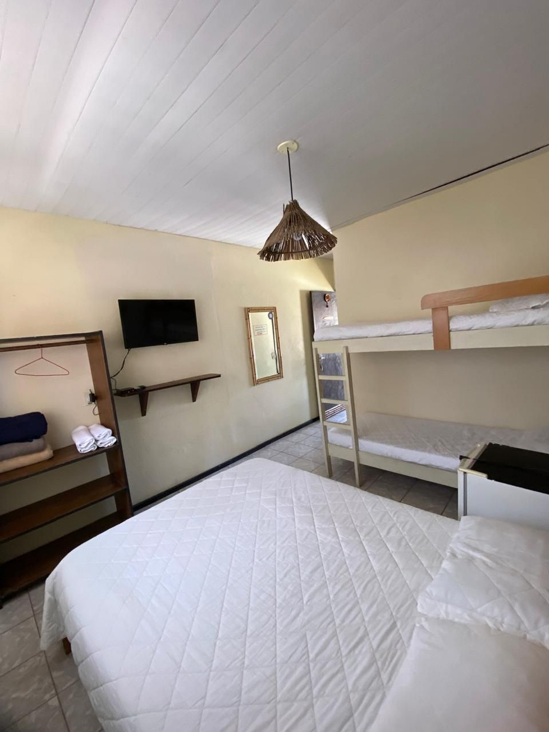 Nossos quartos privativos oferecem cama de casal + beliche, ar-condicionado e frigobar para seu conforto. Roupas de cama, toalhas, TV com canais e Wi-Fi estão inclusos. Cada quarto tem seu banheiro privativo.
